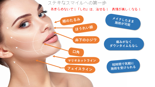 これらの結果、頬~フェイスラインのタルミが取れ、ゴルゴラインやほうれい線が浅く目立ちにくくなります。